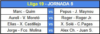 Aquí trobareu les taules de resultats i el ranking, així com els emprarellaments de la jornada següent. Podeu consultar la normativa i reglament de la lliga aquí